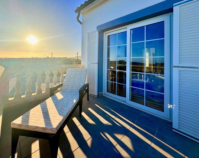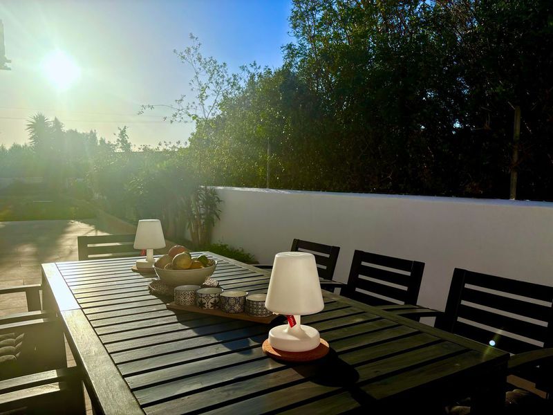 Im Außenbereich könnt ihr Platz am großen Tisch nehmen, euch auf die Sonnenliegen legen oder in den Pool springen.